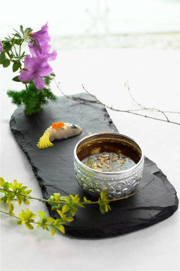 大白花杜鹃家常的吃法是跟蚕豆米煮汤,或者跟腊肉、火腿、鲜肉一起炒,还可以加盐和白酒做成腌菜。董超宇用酸木瓜、梅子醋、泡椒和蒜加高汤一起煮成酸汤,把野生江鱼带皮去骨切成薄片,跟经过去涩处理的大白花杜鹃一起涮熟。大白花杜鹃的口感可以想象成切成半透明的笋片,又薄又肉又有韧性。