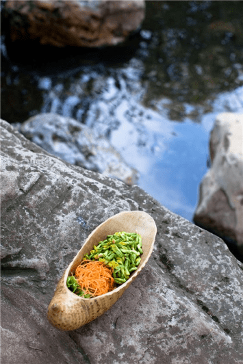 手拿玫瑰花茎整朵吃下,也可以做得不单调乏味,陈生合为每朵花蕊里加入了椰虫,对于没有吃虫习惯的外省人来说犹如一次吃的冒险。椰虫来自景洪市遍种的椰树,把生病将死的椰树砍倒,里面一定有拇指粗大的椰虫。不过每一棵被砍倒的病树上只能找到一到两个椰虫,所以这种食材很稀少。椰虫的口感可以跟蚕蛹比较,但蚕蛹的肉带渣,椰虫的肉却细腻如浆。把椰虫先用水煮,固定里面的蛋白质,然后在油锅里炸香,外面再挂一层薄薄的酸甜汁。用玫瑰花包裹在外面,视觉上不再惊悚,口感也是一片新天地。