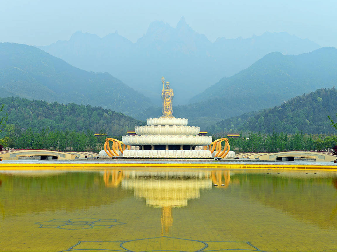 首先去大愿文化园,这里是世界上唯一全面展示地藏文化的景区,最吸引人的是99米高的地藏菩萨圣像,金光闪闪,气势恢宏。如果想了解更多地藏文化,可以进入弘愿堂(60元/人),里面有玉质地藏菩萨成道像和其他展品。大愿文化园没有门票,但是有摆渡车(30元/人),可以节省走路的时间。