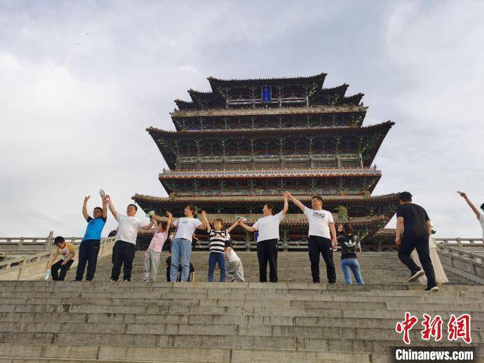 游客在鹳雀楼前打卡留影。 陆浩辰 摄