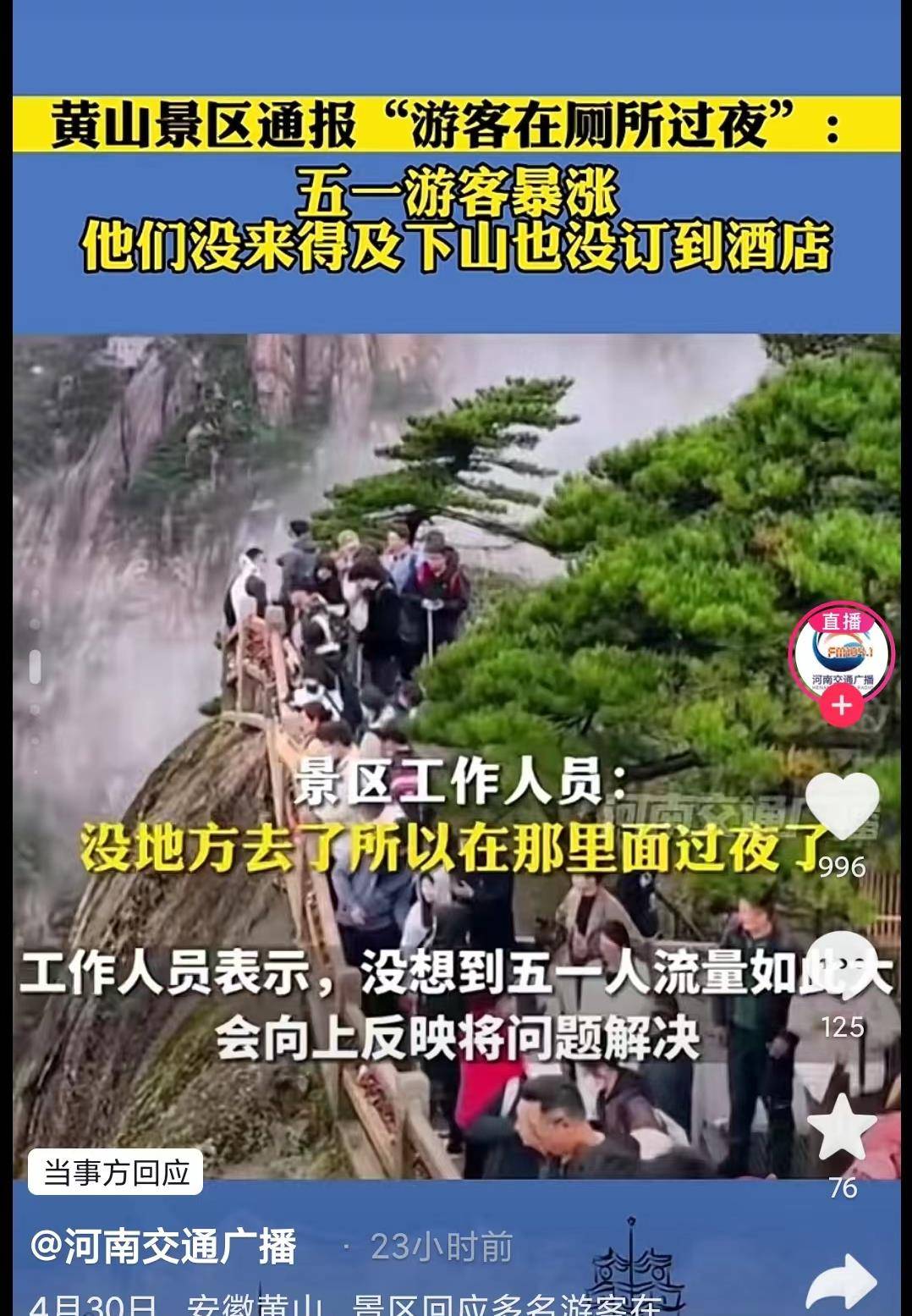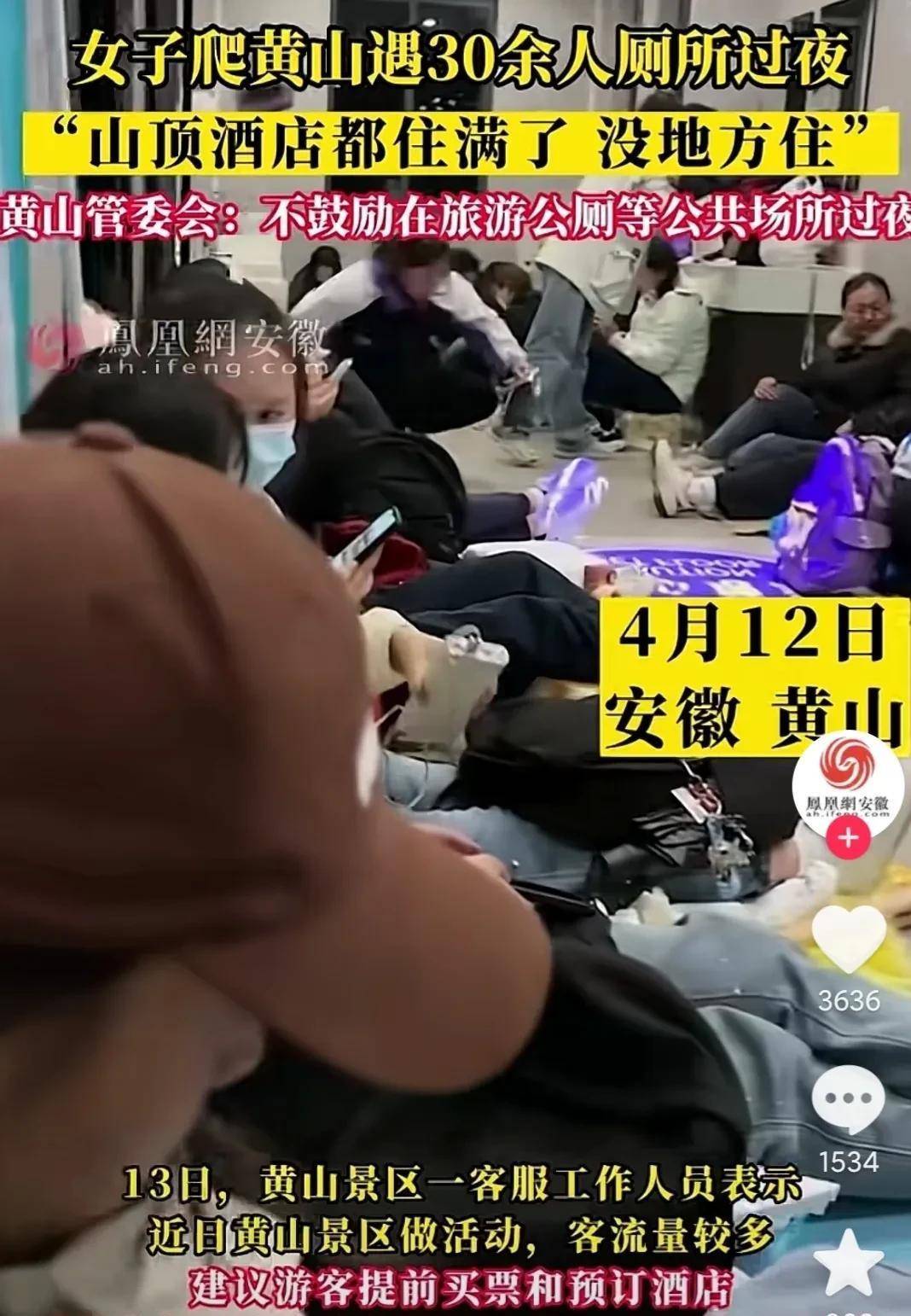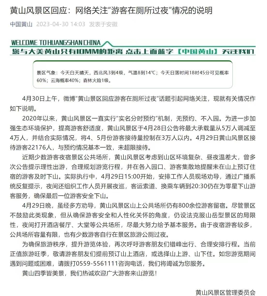 4月30日,安徽黄山景区800余人滞留山顶,百余人挤满景区公厕过夜,现场混乱。视频曝光一举引发舆论关注,官方表示:“不鼓励在公共厕所等公共场所过夜。”