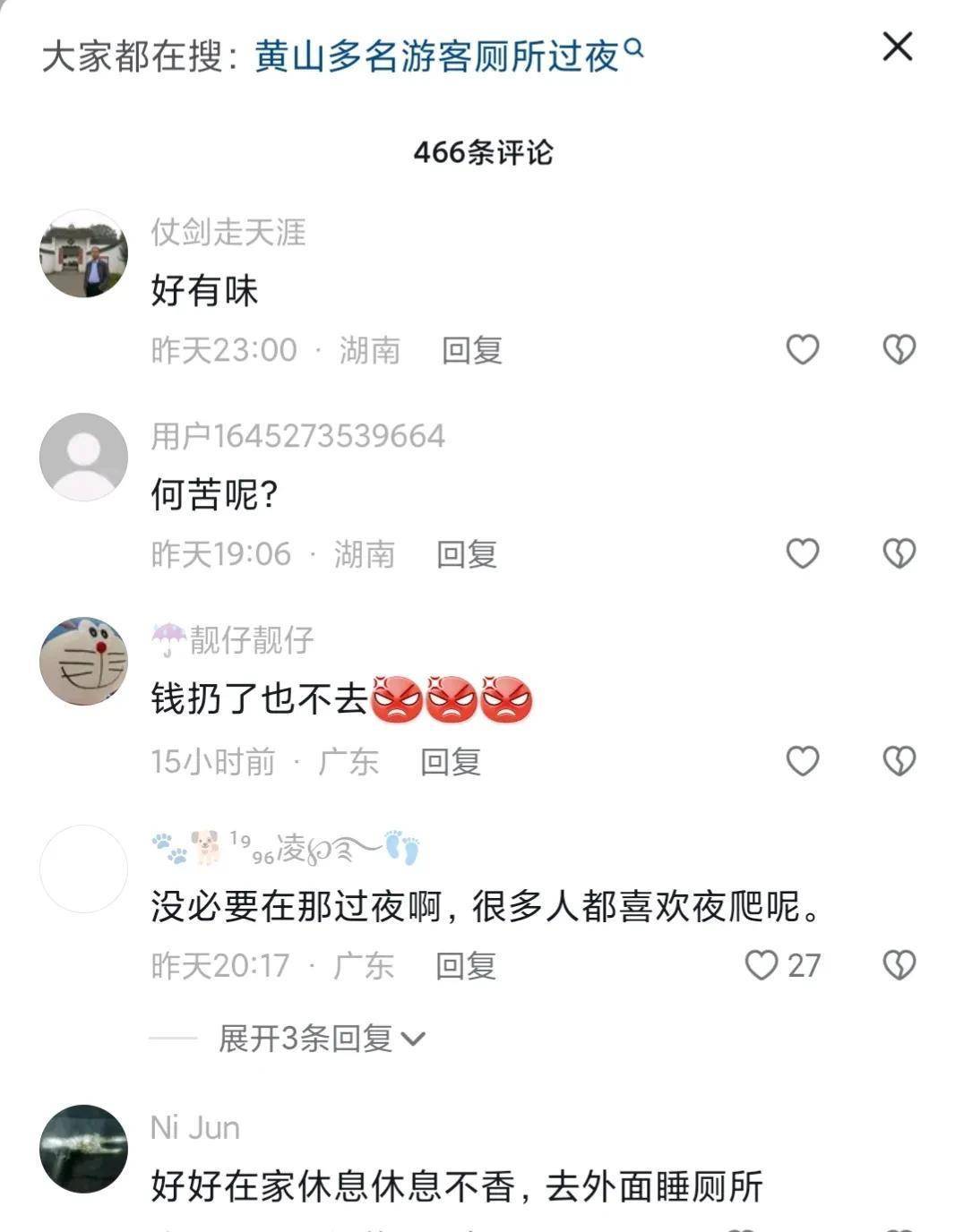 并且,黄山景区禁止自搭建帐篷露营,而黄山属于高山地带,早晚温差极大,游客被迫选择了剩下的可以遮风挡雨,可以解决“三急”的公共厕所。