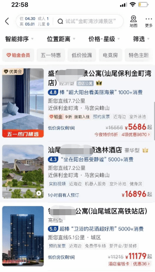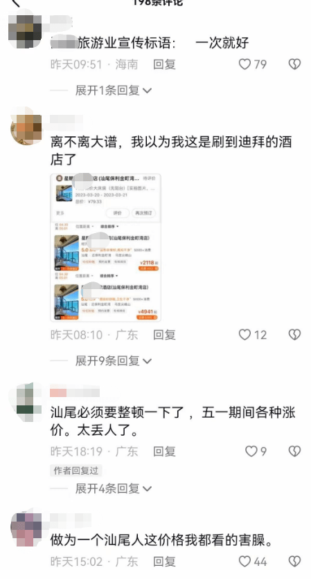 人来了,就会涉及吃住问题。今年的五一,汕尾一些酒店出现了一房难求的困窘局面。大概是“物以稀为贵”,有网友发帖称,多家酒店的五一价格较往常贵了不少,有的甚至比平时翻了数倍。