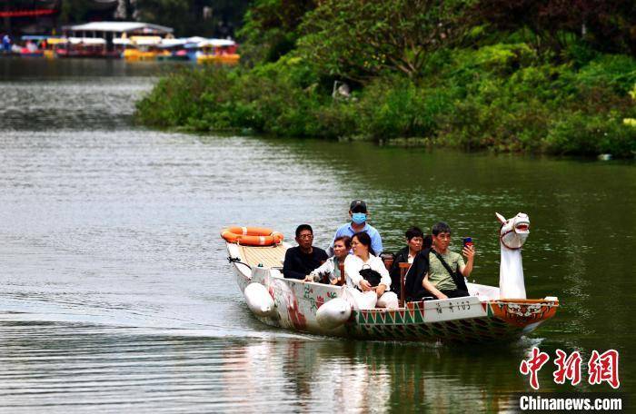 图为一艘游乐龙舟载着游客行驶在福州西湖。 张斌 摄