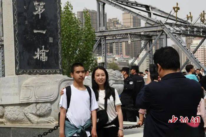 图为游客在中山桥旁的“黄河第一桥”纪念碑前拍照留念。戴文昌 摄