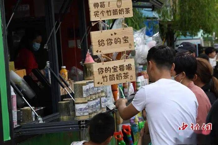 图为游客在中山桥旁边的便利店购买竹筒奶茶。戴文昌 摄