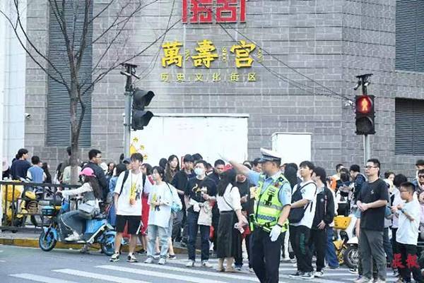 ▲“五一”假期,南昌万寿宫附近人流如潮,交警正在维持通行秩序。