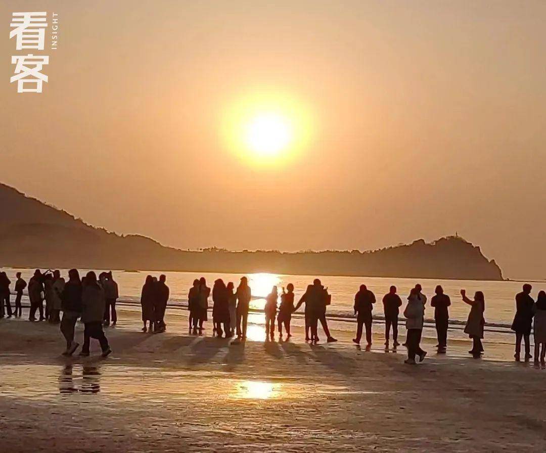 石老人浴场旁看日出的人们。发朋友圈的时候,秋秋发现有三四个朋友都跟她同一时间在这里看日出