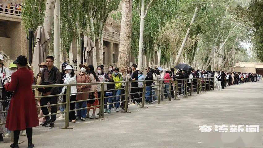 “五一”小长假,莫高窟洞窟外、景区入口处人潮涌动,虽然游客爆发式增长,但景区内秩序井然。敦煌鸣沙山·月牙泉景区的游客量也一路“狂飙”,4月30日游客接待量突破20000人次。