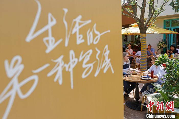 外籍游客在蟠龙天地聊天。 殷立勤 摄