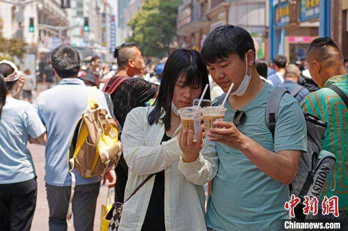 游客在南京东路步行街上拍摄咖啡。 殷立勤 摄