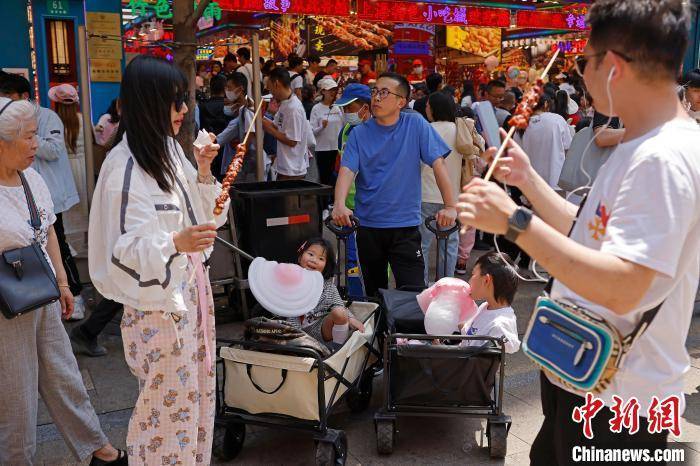 游客带着孩子在南京东路步行街上品尝美食。 殷立勤 摄