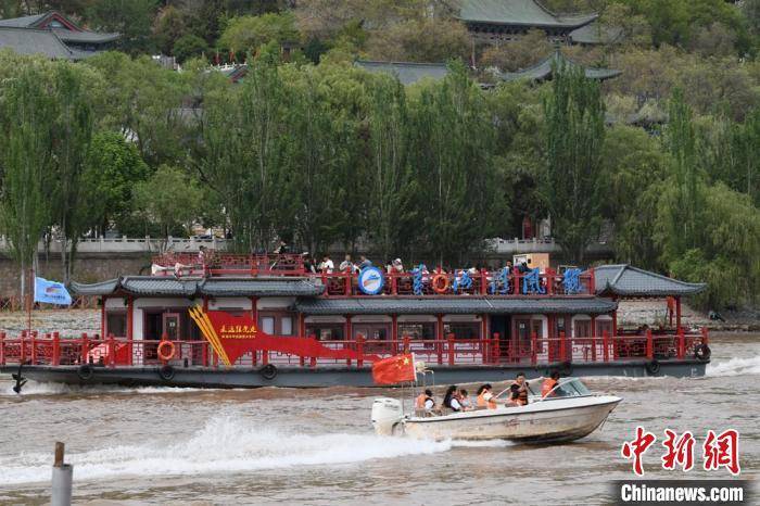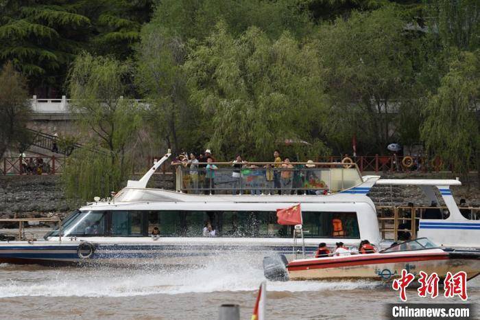 “五一”小长假期间,乘坐水上交通工具游览黄河风情线备受游客欢迎。图为游艇和快艇黄河上“会车”。 戴文昌 摄