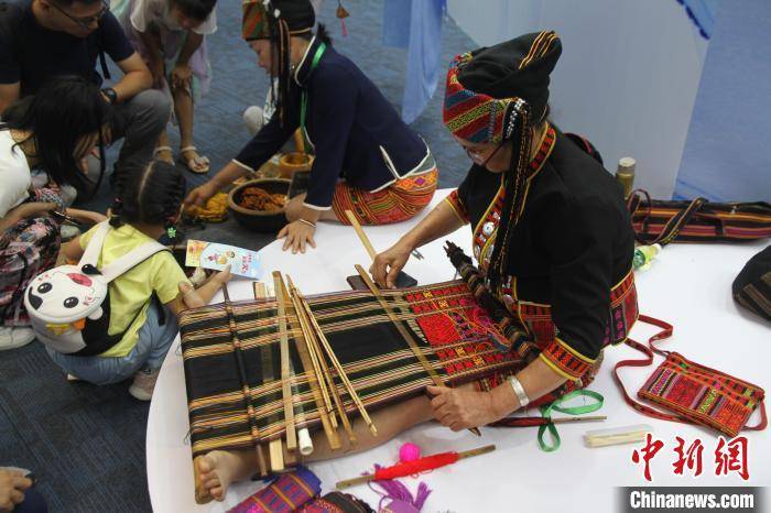 在海南省图书馆,2023年(第三届)海南锦绣世界文化周非物质文化遗产传统织绣印染技艺项目精品展正在举行,市民游客不仅可以观赏黎族传统纺染织绣技艺传承人现场展示黎锦织绣,还能亲自体验染纱、藤编等黎族传统工艺。