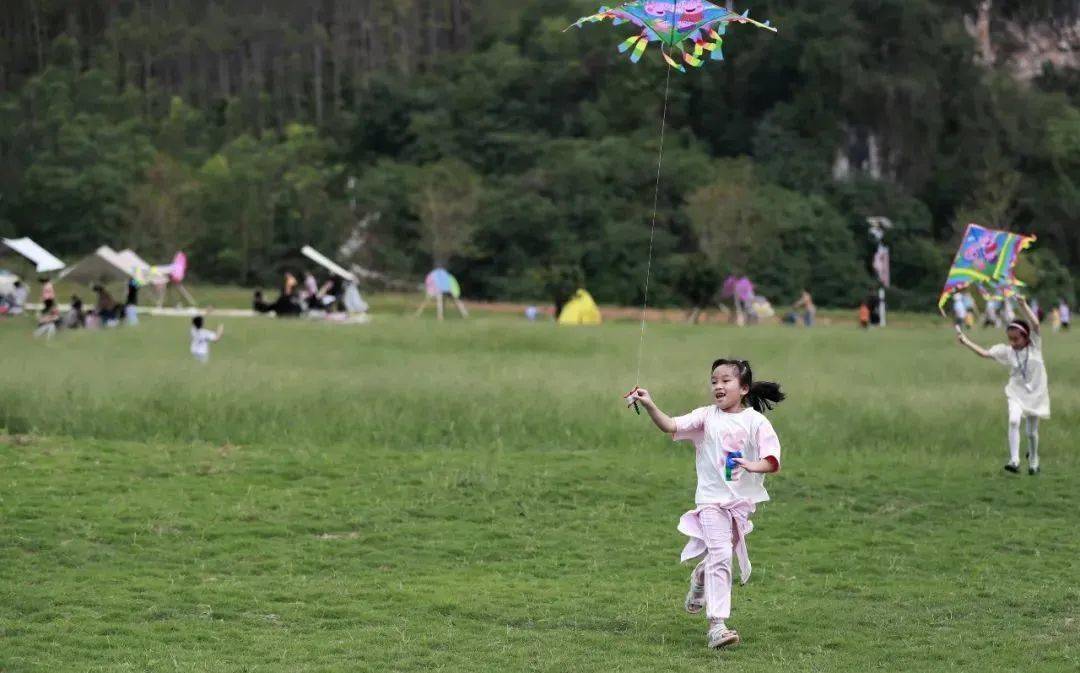 4月29日,游客在石埠乳业山水牧歌休闲观光牧场放风筝,畅享假日美好时光。 卢文斐 摄