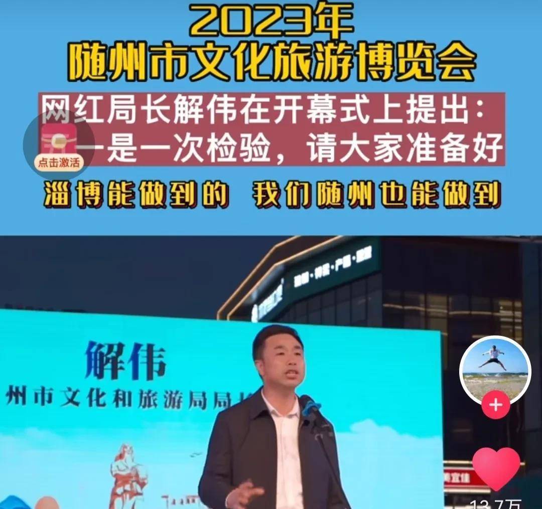 2023年随州市文化旅游博览会网红局长解伟在开幕式上提出:五一是一次检验,请大家准备好!淄博能做到,我们随州也能做到!