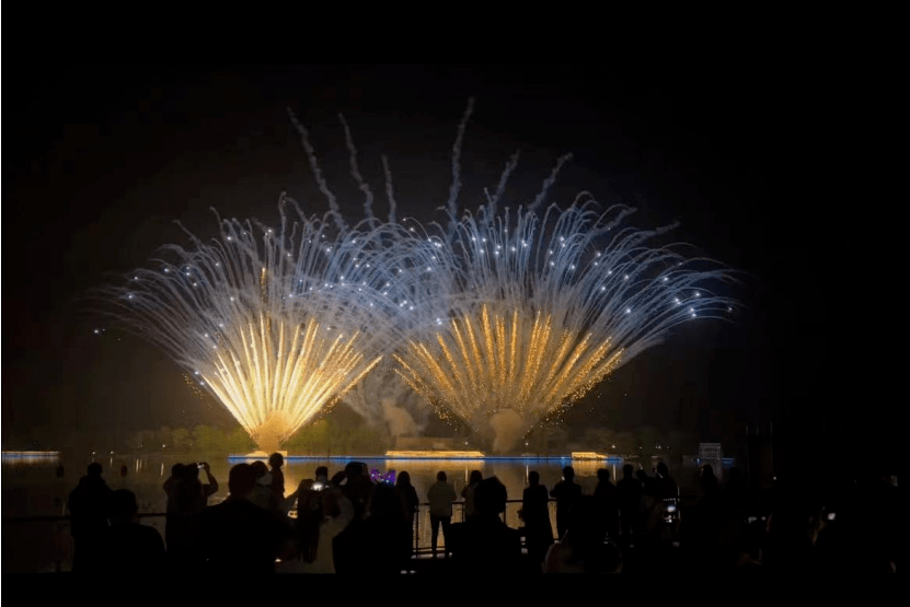 国家级4A景区中国爱情花卉小镇在“五一”假期,每天安排了烟花秀、音乐趴、国潮巡游等十多个游客观赏体验项目。尤其是水幕烟花秀表演把游客的兴致拉到极致。
