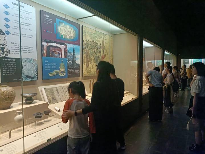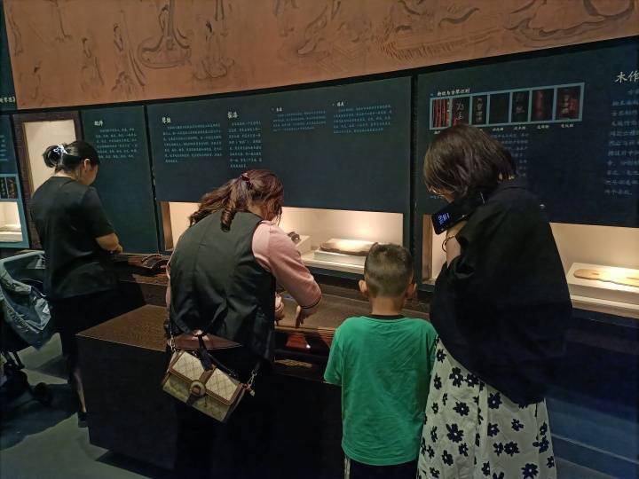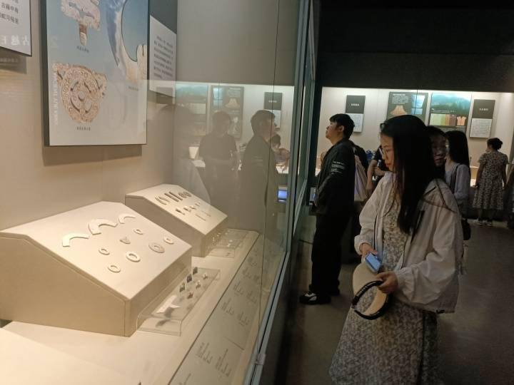 像小董这样,许多游客都是因为五一小长假,第一次来到浙博武林馆区。有带着小朋友来了解浙江人文历史的年轻夫妻,有带着爸妈来休闲娱乐的打工人,也有对着国宝清单逐个打卡的博物馆“特种兵”;一对小情侣望着展柜里的玉器感叹“真好看,好浪漫”,或许这些玉器也曾见证过良渚时期的爱情;还有小孩子围着互动视频,一遍遍听古老神秘的《越人歌》……