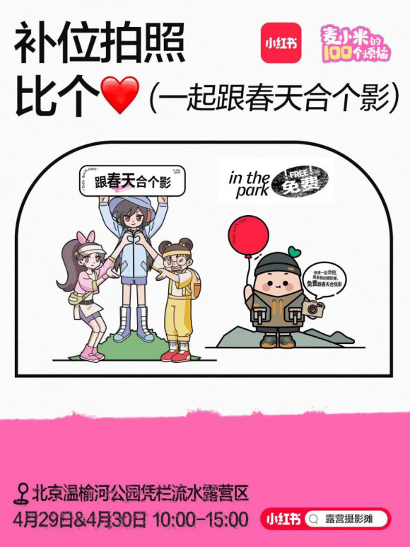 活动自2023年4月29日开始至5月3日,摄影师用小红书的官方摆摊物料,在全国范围的露营公园与绿地上布置摊位,届时,北京温榆河公园、上海世纪公园、广州珠江公园、西安昆明池·七夕公园会在指定区域发放活动周边,民众可免费领取,按照周边信息提示,找到拿着红色气球的摄影师并礼貌邀请,就能获得免费拍照的机会。故事IP“麦小米的100个烦恼”主人公麦小米、筱可艾、方头头将以合影装置的形式“现身”北京温榆河公园,孩子们可以在4月29至4月30日前往园区参与活动,合影留念。