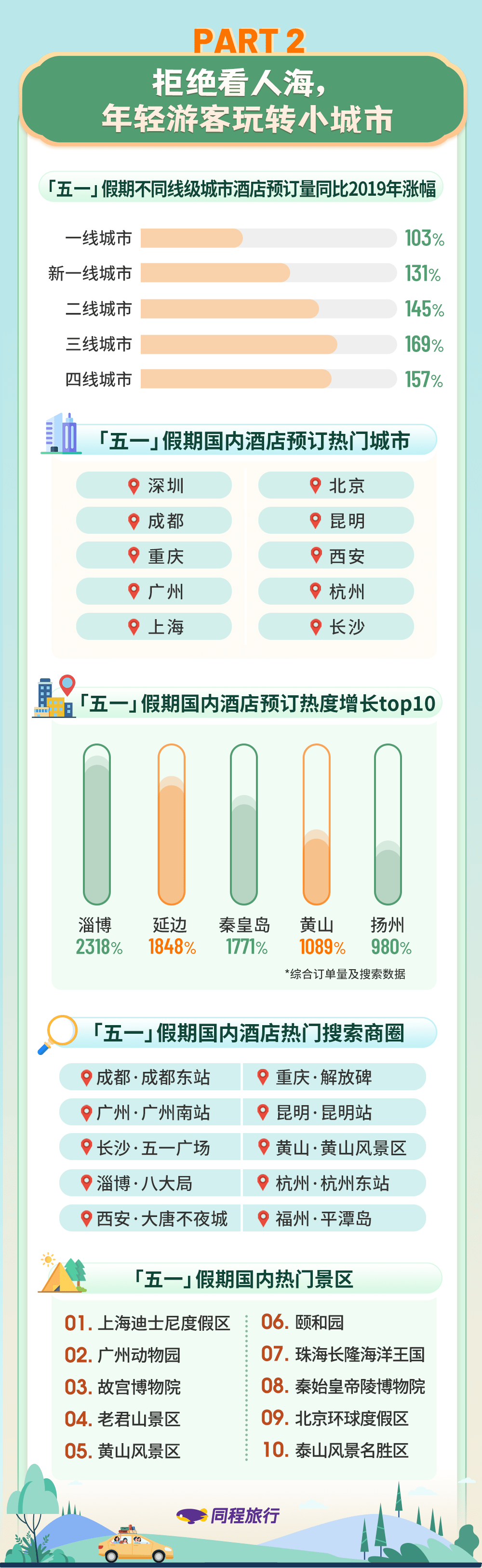 同程研究院相关负责人介绍,从单个城市看来,小城市的城市体量和整体接待能力无法赶超一二线城市,但从整体市场规模上看,数量众多的小城市为“五一”假期旅游消费市场贡献了更多增量。同程旅行数据显示,今年“五一”假期酒店预订热度增长最快的是新近走红的山东淄博。此外,延边、秦皇岛、黄山等城市酒店预订热度增长也在10倍以上。