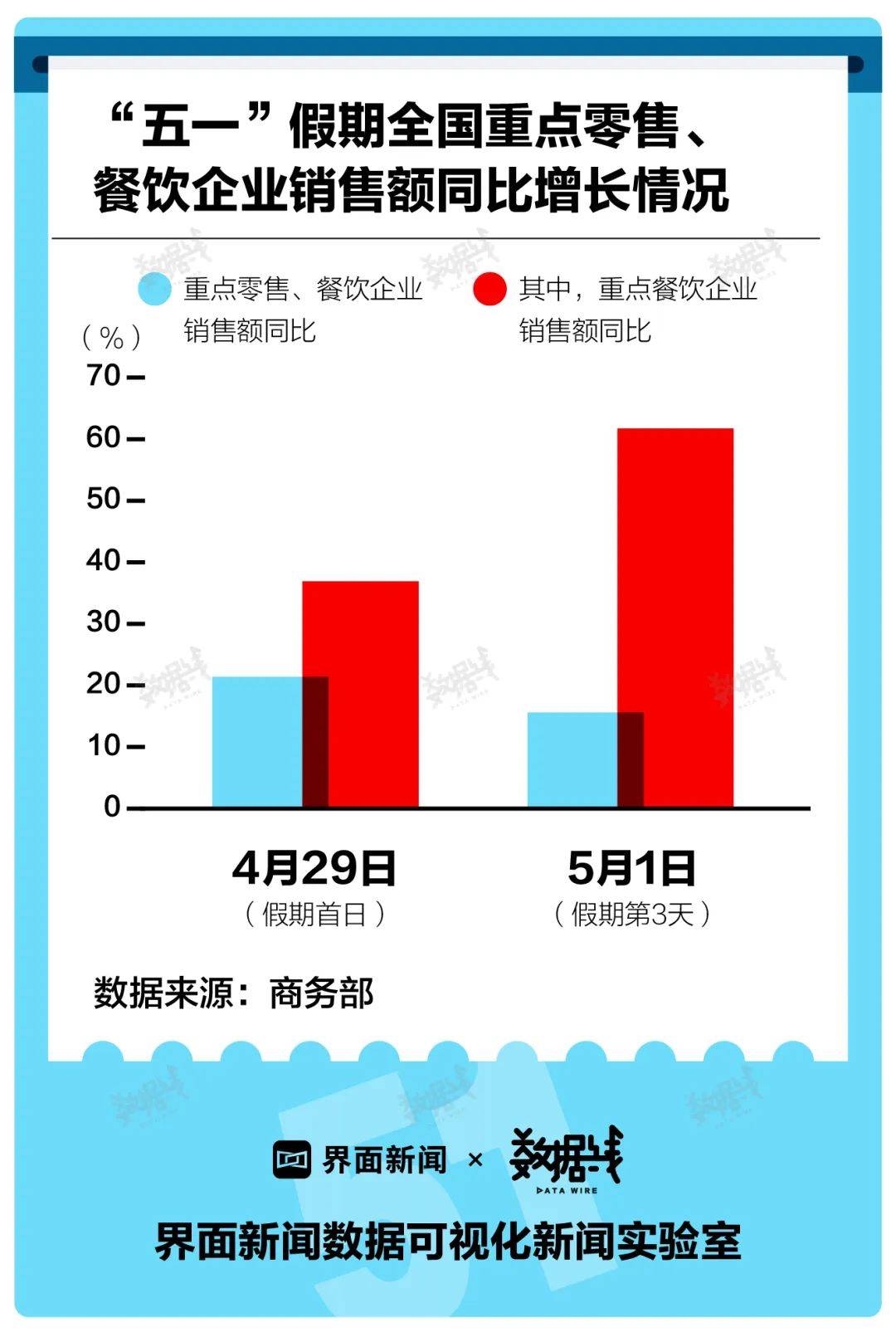 据商务部商务大数据监测,“五一”假期首日和第3天,全国重点零售和餐饮企业销售额分别同比增长21.4%、15.6%。其中,重点餐饮企业销售额涨得越来越猛,涨幅从超3成扩大至超6成。