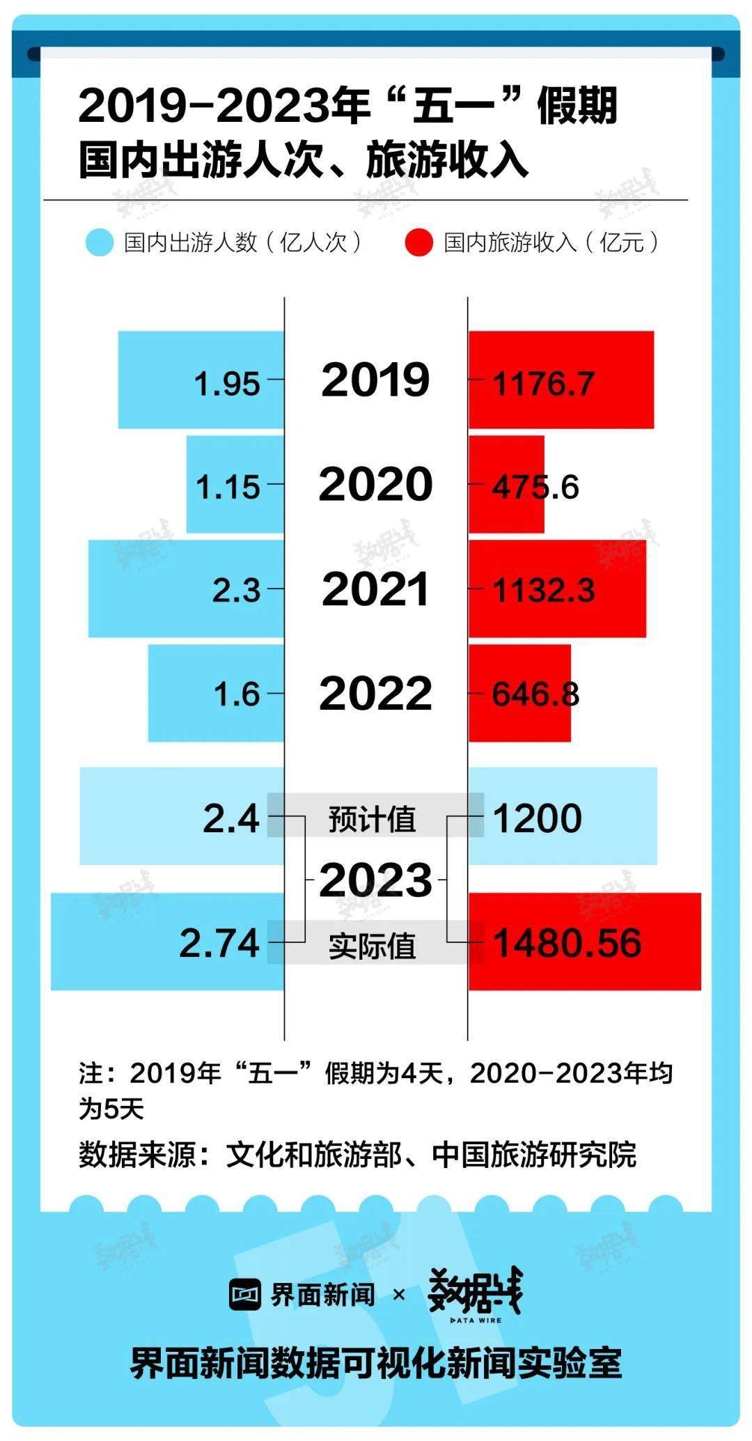 2023年“五一”假期出游人次、国内旅游收入均超疫情前水平,餐饮企业销售额猛涨,三四线城市旅游市场热度大增。消费火爆的同时,出境游尚未完全恢复,电影票房未及2019年同期。