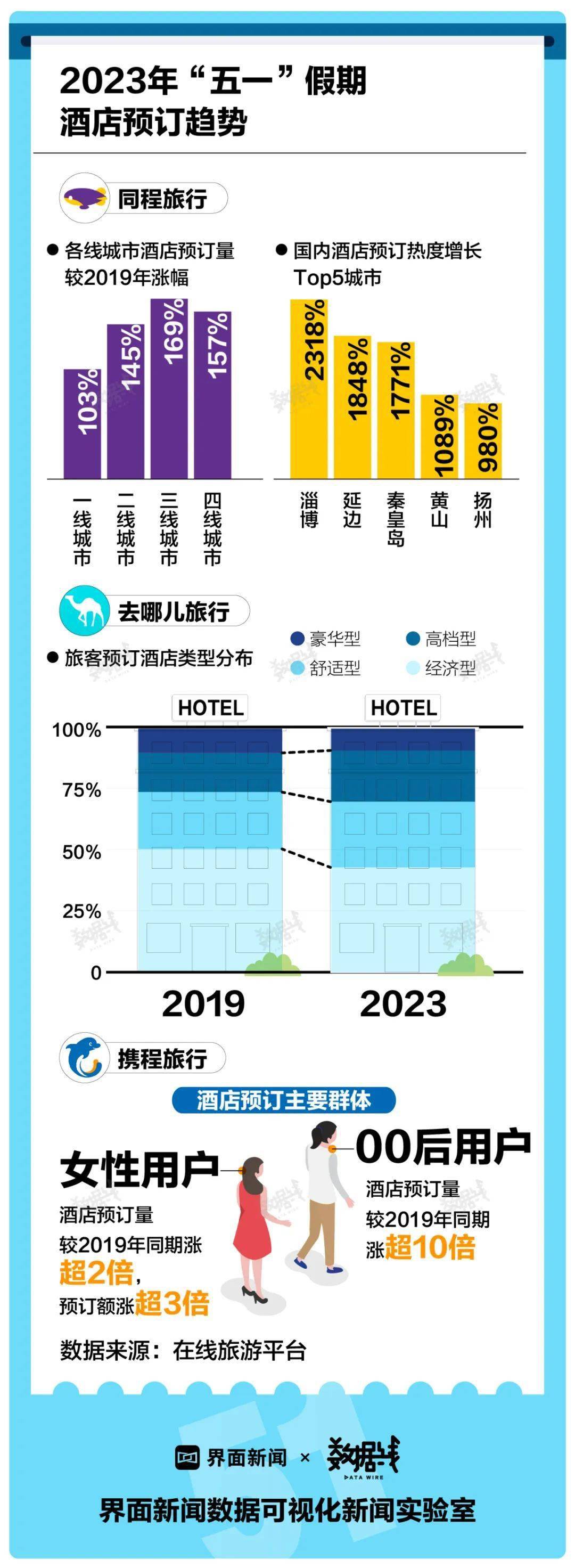 三、四线城市旅游同样火爆。据同程旅行数据,“五一”假期国内三线及以下城市酒店预订量较2019年同期增长超150%;酒店预订热度增长最快的是山东淄博,上涨超23倍。去哪儿数据显示,今年“五一”假期高档型、舒适型酒店预订合计占比48%,较2019年同期提升9个百分点。另据携程数据,女性和“00后”在酒店预订上购买力强劲。