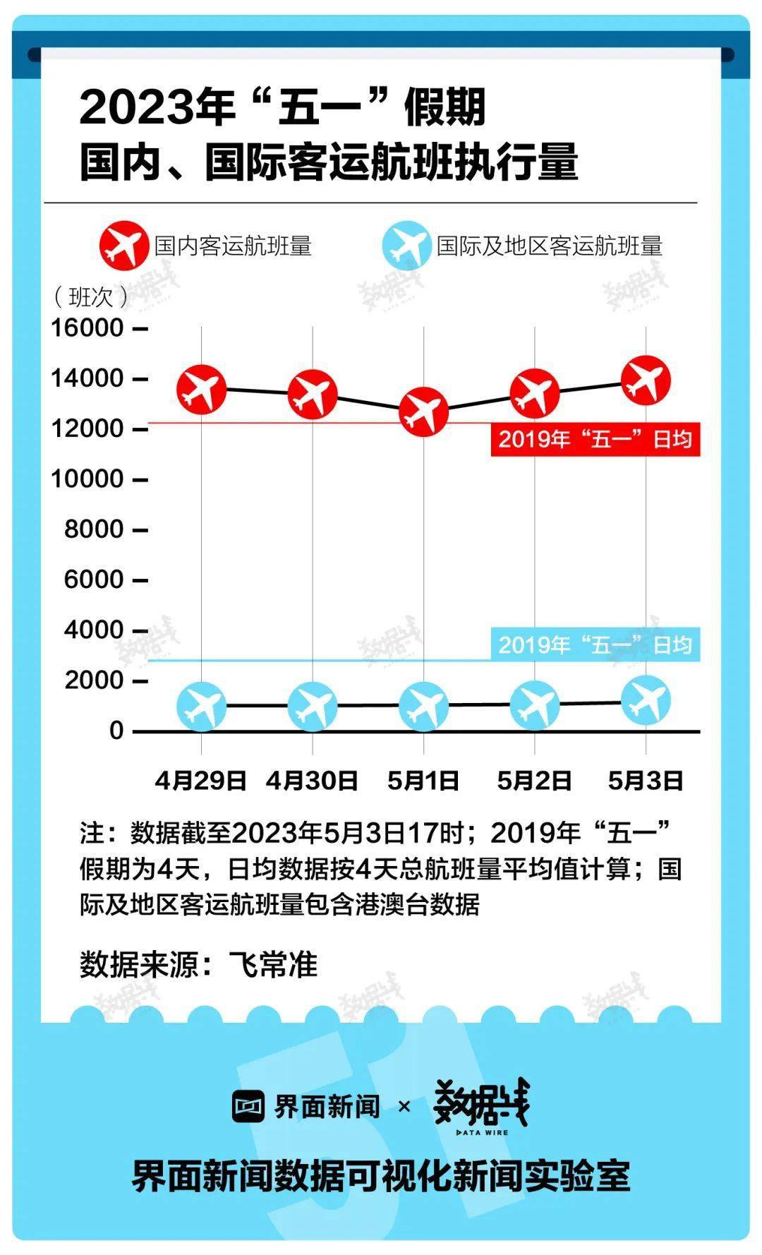 中国民航局数据显示,4月29日至5月3日,民航预计累计保障航班80089班,日均16017班,与2019年“五一”假期持平。