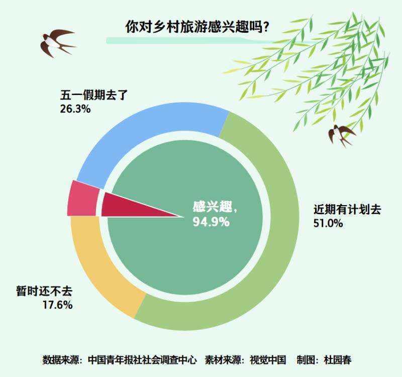 调查显示,94.9%的受访者对乡村旅游感兴趣。26.3%的受访者这个五一小长假就走进了乡村,51.0%的受访者近期计划前往乡村。
