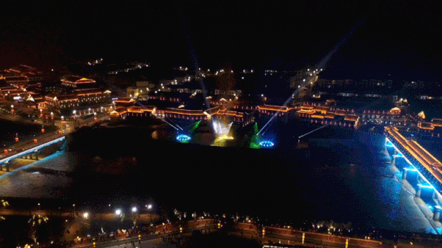 河畔的水幕灯光秀接替而起,澎湃的峡谷之水在声、光、电的魔幻催化下,描绘出一幕幕瑰丽、神秘的巴国图卷。