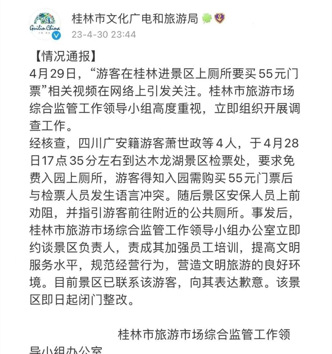 事情出现后,桂林市文旅局是第一时间进行处理了,处罚也不可谓不重——木龙湖景区闭门整改。在假期里关门,对于景区打击可是非常严重的,还涉及到已经购票的团队客退票,损失非常大。应该说,桂林文旅局的处理是很好了。