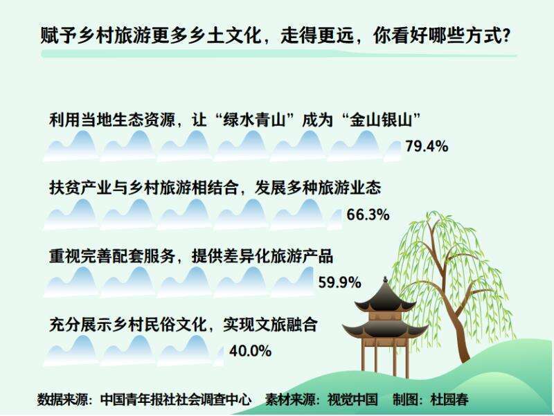 日前,中国青年报社社会调查中心联合问卷网(wenjuan.com),对2003名受访者进行的一项调查显示,赋予乡村旅游更多乡土文化,走得更远,79.4%的受访者看好利用当地生态资源发展的模式,让“绿水青山”成为“金山银山”。66.3%的受访者希望重视扶贫产业与乡村旅游相结合,发展多种旅游业态。
