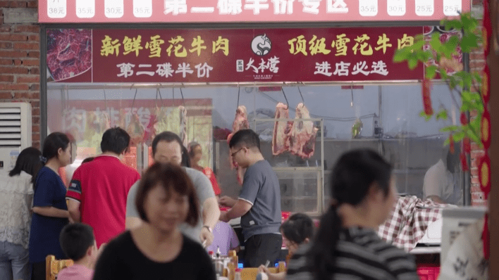 到了饭点,五洞村人头攒动,所有牛肉餐馆都是座无虚席。经营者们为了打响品牌,吸引和留住更多食客,都纷纷推出各种优惠活动,并开发更多牛肉菜式和牛肉元素的产品。