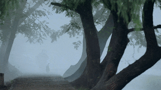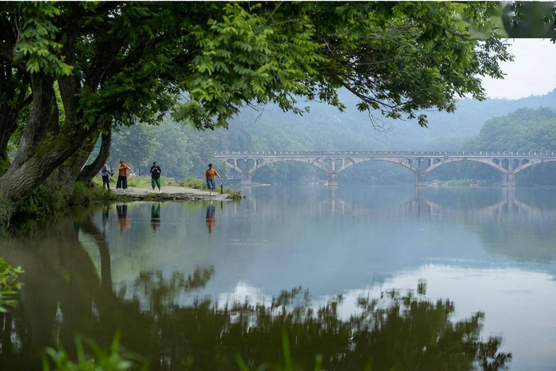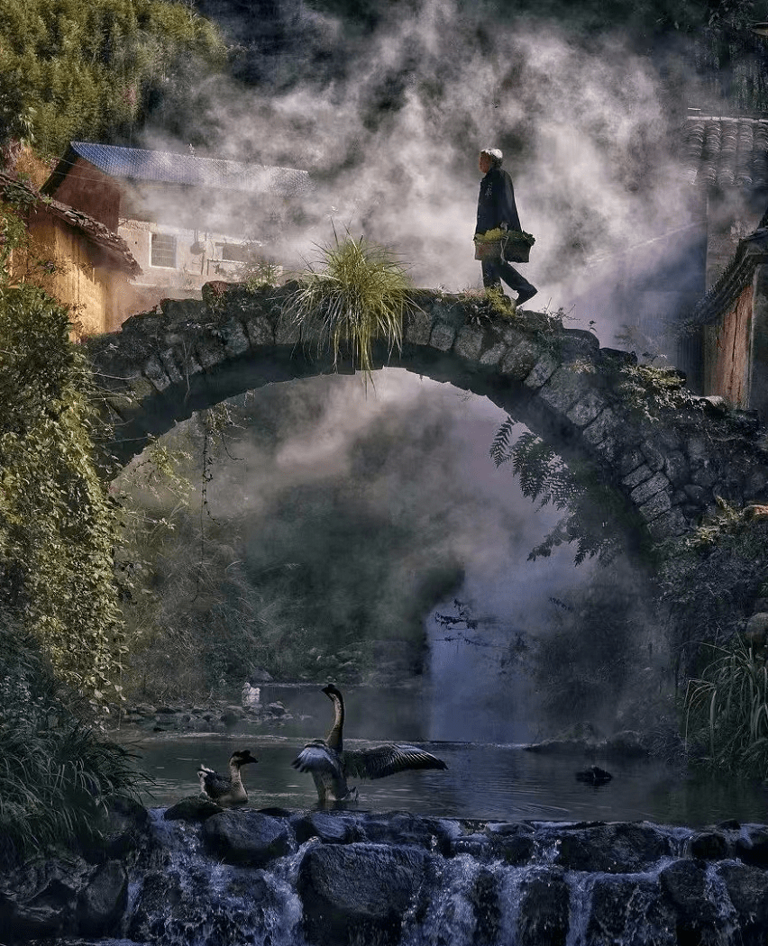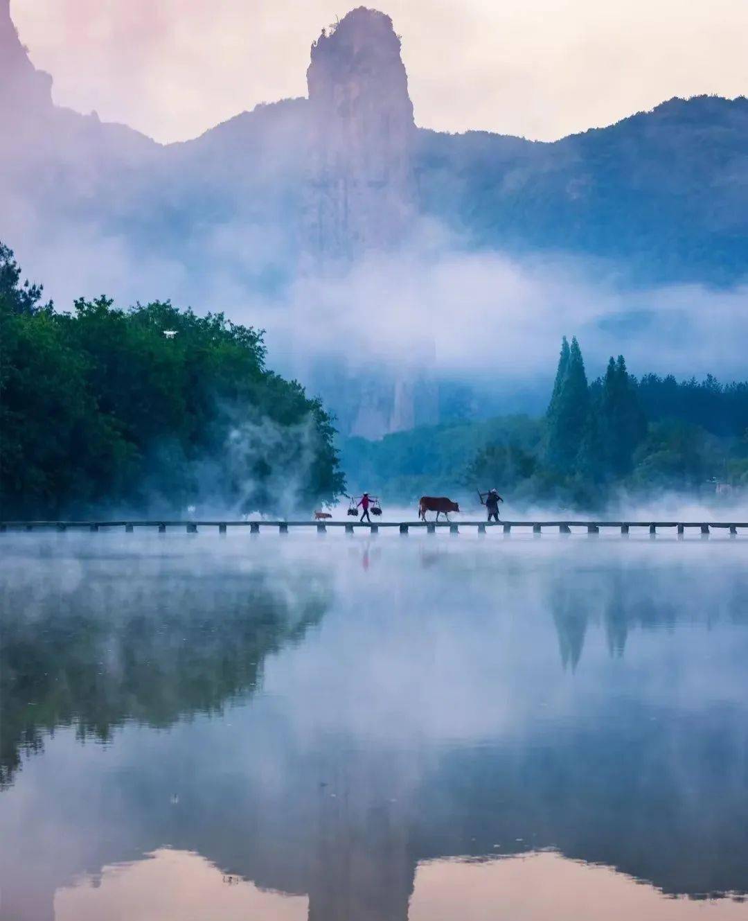 水雾氤氲的清晨时分,自悠长的石梁桥上涉水而过,两岸杨柳婆娑,身后重峦叠嶂,宛如误入了如梦如幻的仙境。