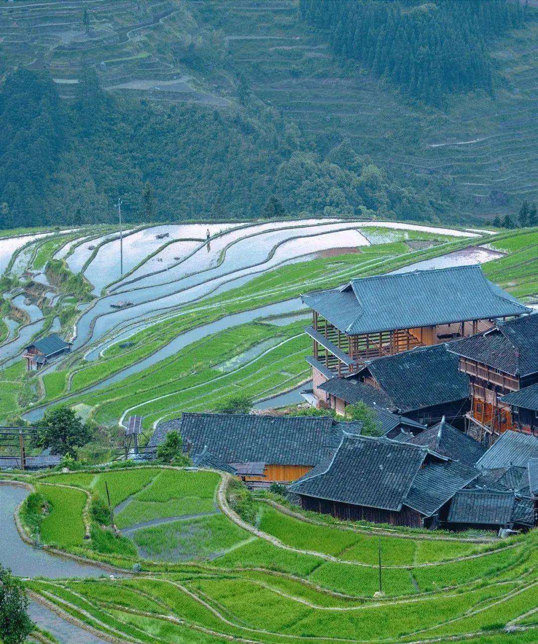 每年4、5月的时候,梯田便开始灌水,清冽的山泉涌入了一畦畦田野,仿佛在山间淌出了一湾湾湖泊,蓝天白云倒映在水田间,简直美得让人心醉。