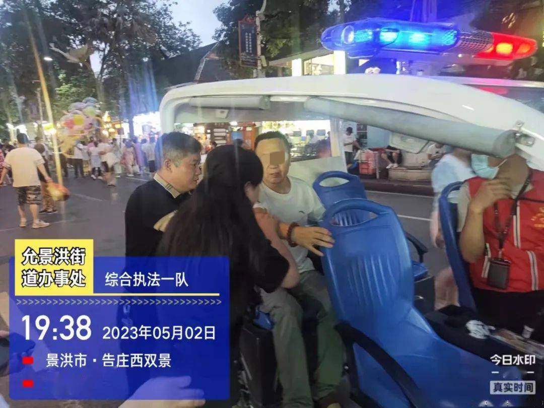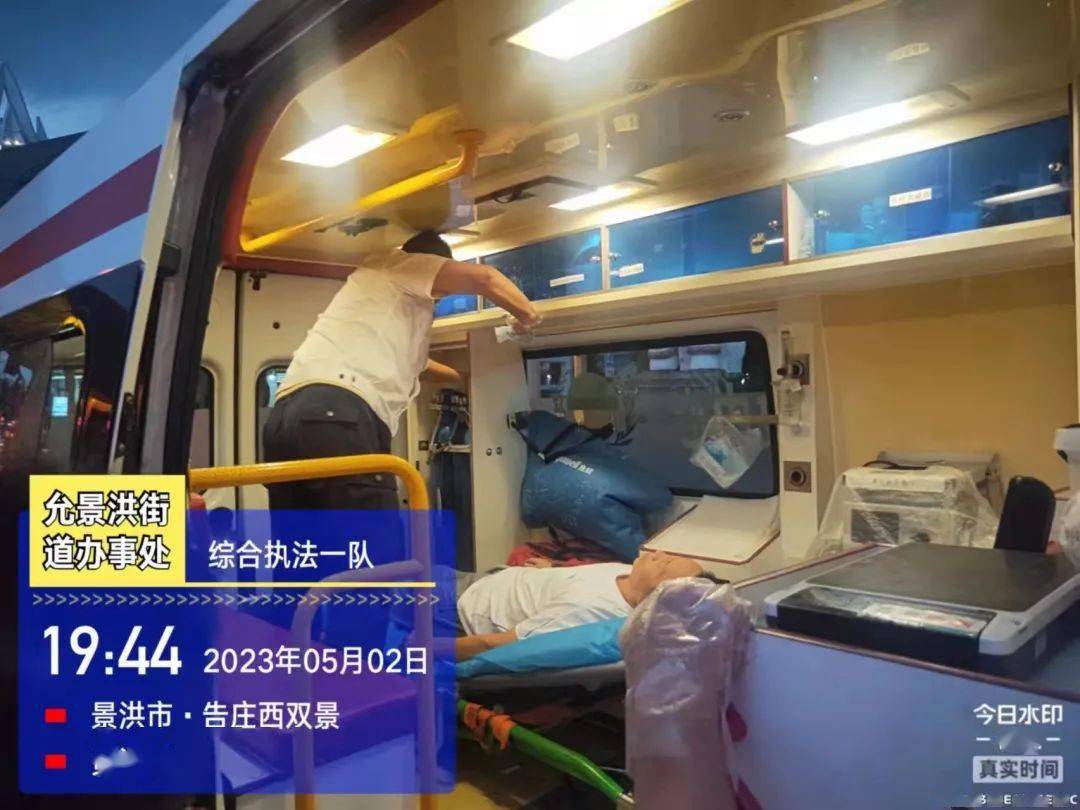 危急时刻,允景洪街道综合执法队队员黄添瑞、陈海贵正好开车巡查经过,曹女士便立即上前寻求帮助,“我们这有人晕倒了,救护车进不到这儿,你们能不能帮我们把人送到景区门口,救护车在那儿等着。”