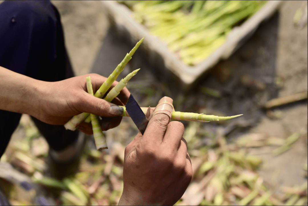 在经过每日上千次的寻找、弯腰、徒手采摘、剥皮等步骤之后,这些鲜笋再在几个小时的徒步运输后,才会送到收笋人的手中。