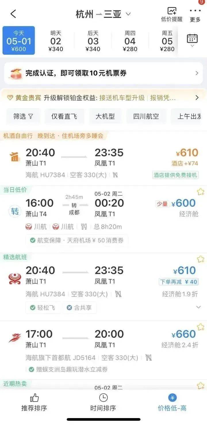 “五一”前,杭州飞三亚价格最低2800元,5月1日机票价格是600元, 而到5月4日,杭州飞三亚居然只要280元。