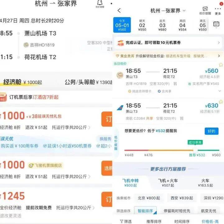 在相关平台上可以查到,不少机票从5月1日开始就出现了不同程度下降。杭州飞北京,5月1日,最低价为573元;杭州飞昆明,5月1日出发价格为600元。