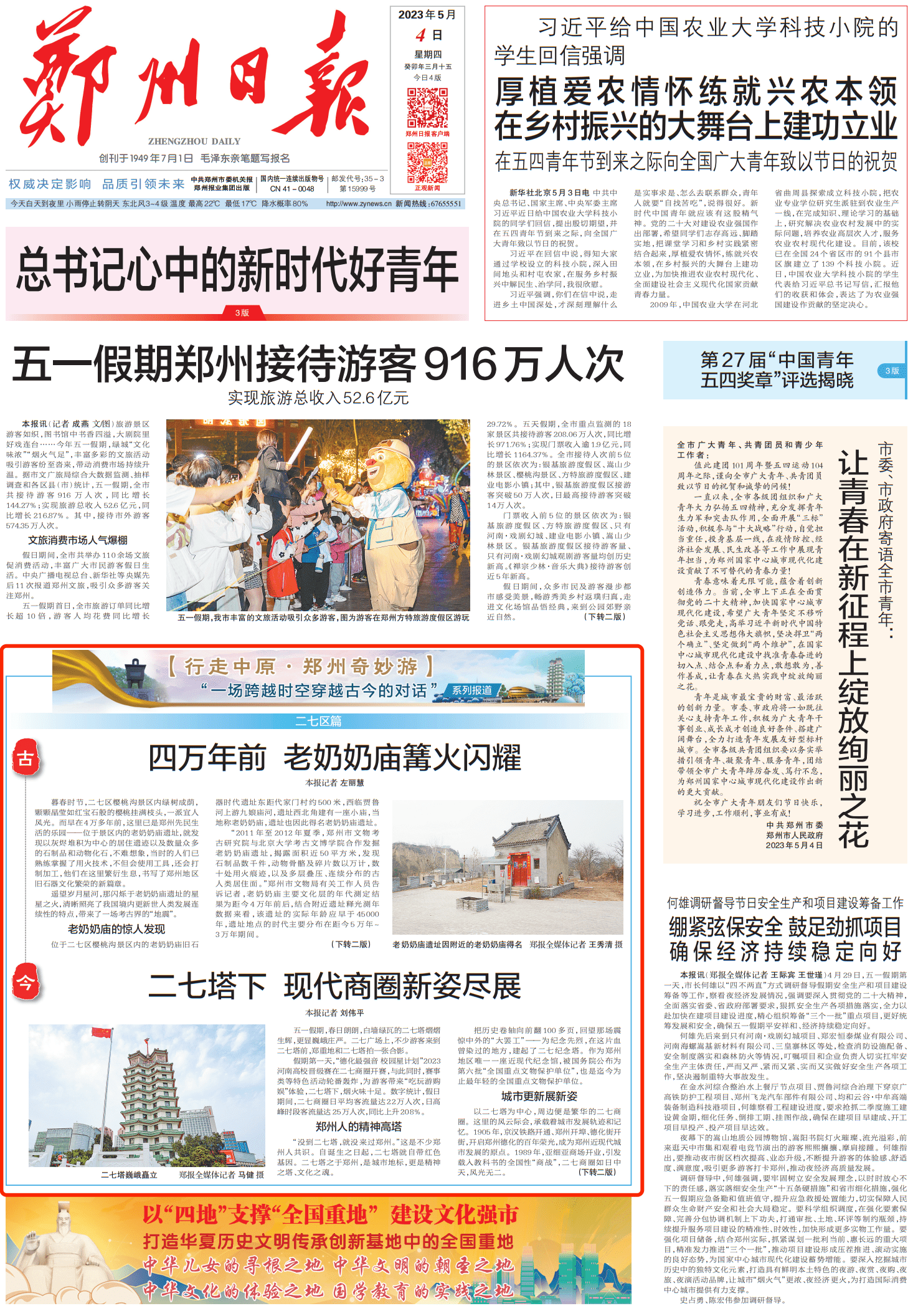郑州,是华夏文明的重要发祥地;流经这里的黄河,是中华民族的摇篮。生于斯、长于斯的你,对家乡郑州是否真的了解?时光荏苒,沧海桑田,它是否还是你记忆中的模样?巍巍商都,闪耀着中华文明的光彩,为古都郑州点亮当今、照见未来。为给读者展现一个立体、生动的“郑州”,本报今起推出《行走中原·郑州奇妙游》“一场跨越时空穿越古今的对话”系列报道,以全市各区县(市)为区划,从小处入手讲述郑州故事。