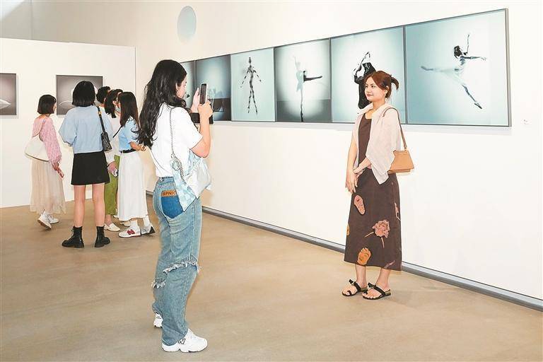 市民游客在喜爱的作品前合照。