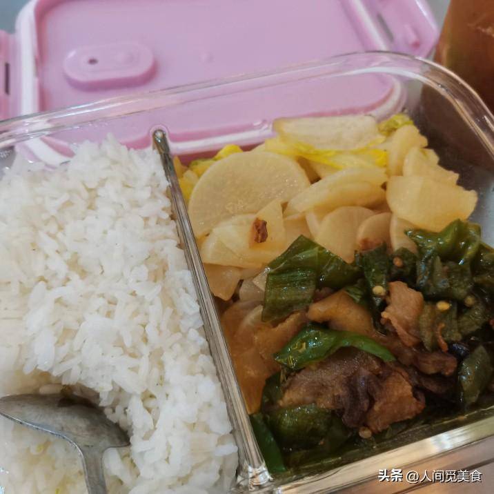 第二天是辣椒炒肉,她用的是五花肉来炒,五花肉煸香后会有很多猪油,炒辣椒的话油润可口不腻,搭配爽口的白菜和胡白萝卜更是解腻开胃,配米饭简直绝了。这样的小炒肉微微的辣很上头,比一般的荤菜要更下饭。