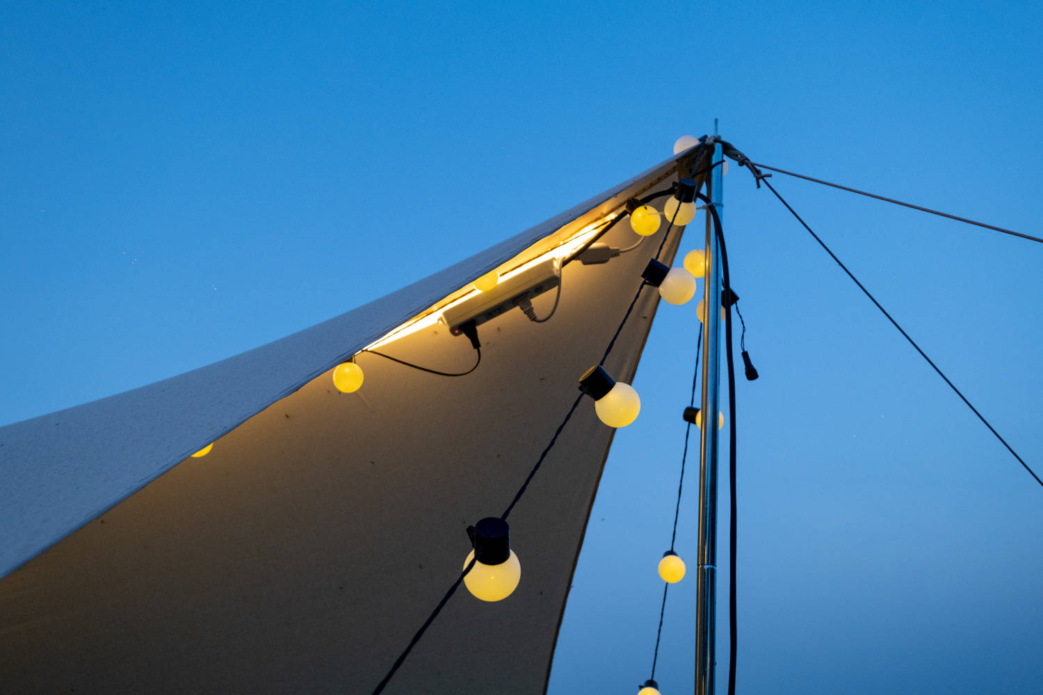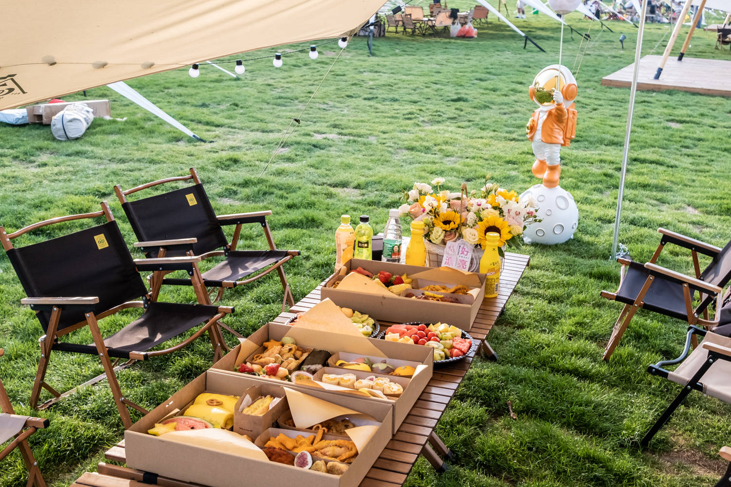 落地帐篷搭配上专用野餐桌、美美的桌布、躺椅、毛毯、彩色灯带,氛围拉满!