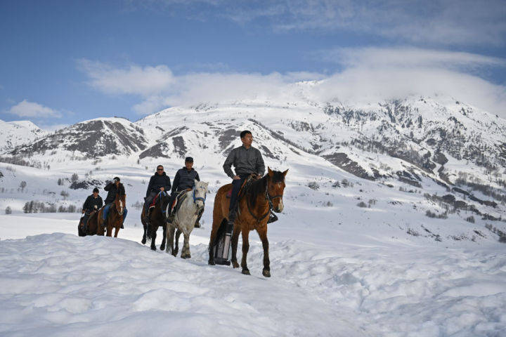 ↑3月30日,苏卡(左一)和马队成员骑马下山。