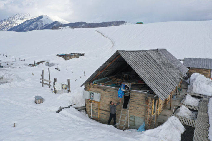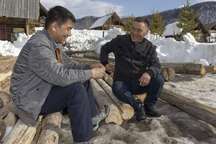 从孟格得家出来,正好路过吾云老人的家,老太太正在把旅游旺季时使用的一些东西收拾好放到木屋上面的储藏室去,苏卡又赶紧过去帮忙。现在旅游旺季已经过去,很多村民已经去布尔津或者阿勒泰与亲人们相聚,还有的已经出发去旅游,但对苏卡来说,忙碌的工作又进入到下一个阶段:他要趁这段时间为禾木村的持续发展做好规划和准备,另外,等雪化了,他还要带领村民把整个禾木村的卫生打扫一遍,迎接将于5月到来的下一个旅游旺季。