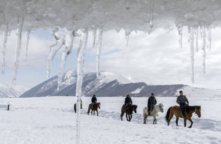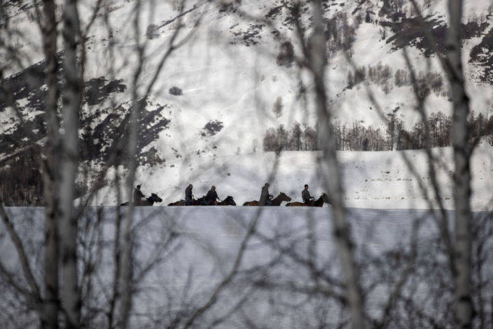 ↑3月30日,苏卡(右一)和马队成员骑马上山。