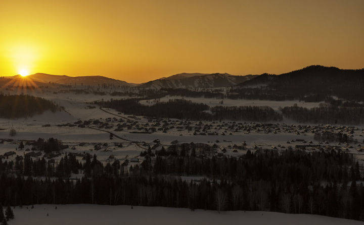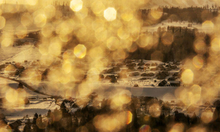 8点20左右,太阳从山后露出头来,将第一抹阳光洒满禾木村。一座座覆盖着白雪的木屋瞬间沐浴在金色的光芒中,并且变得熠熠生辉起来。