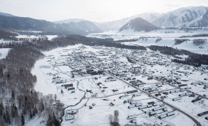 ↑3月30日,苏卡(中)和马队队员在禾木村后山的观景平台上眺望村落,商议未来的发展(无人机照片)。