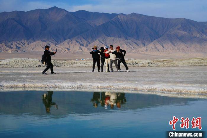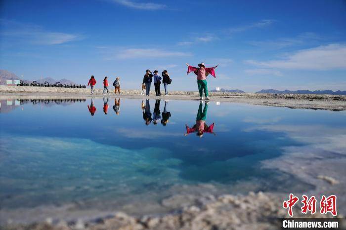 图为游客在大柴旦翡翠湖拍照留念。 马铭言 摄
