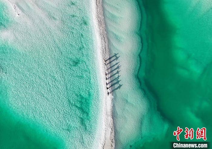 航拍游客在大柴旦翡翠湖摆造型拍照。 马铭言 摄